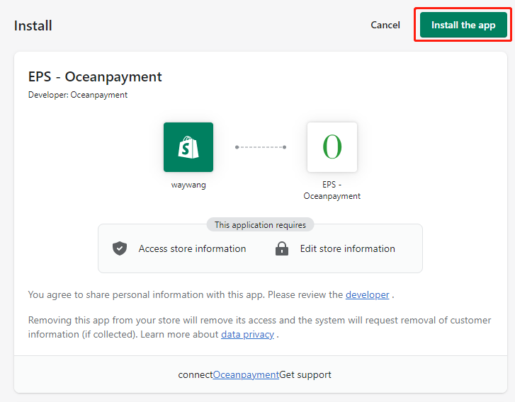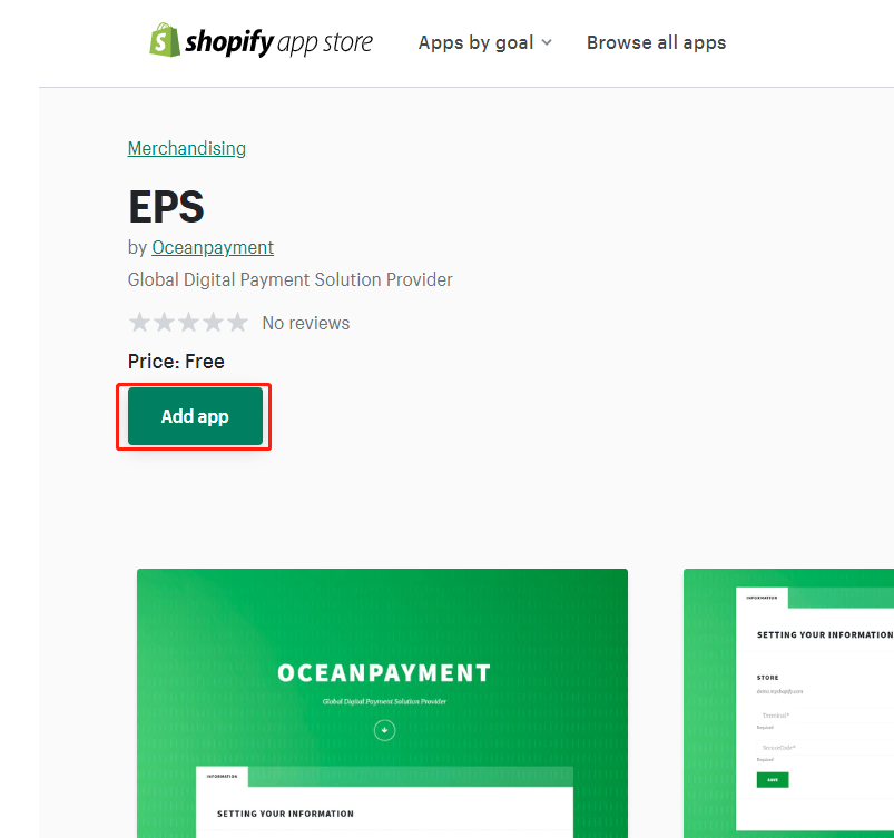 1.   通过APP应用市场找到Oceanpayment安装:https://apps.shopify.com/eps