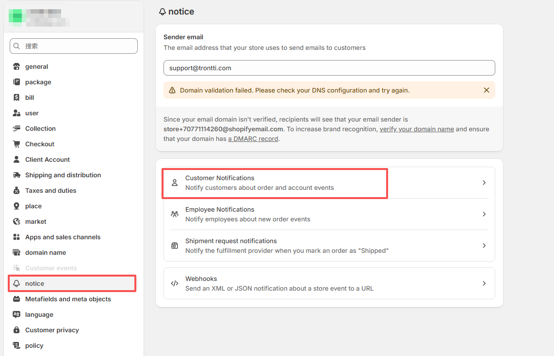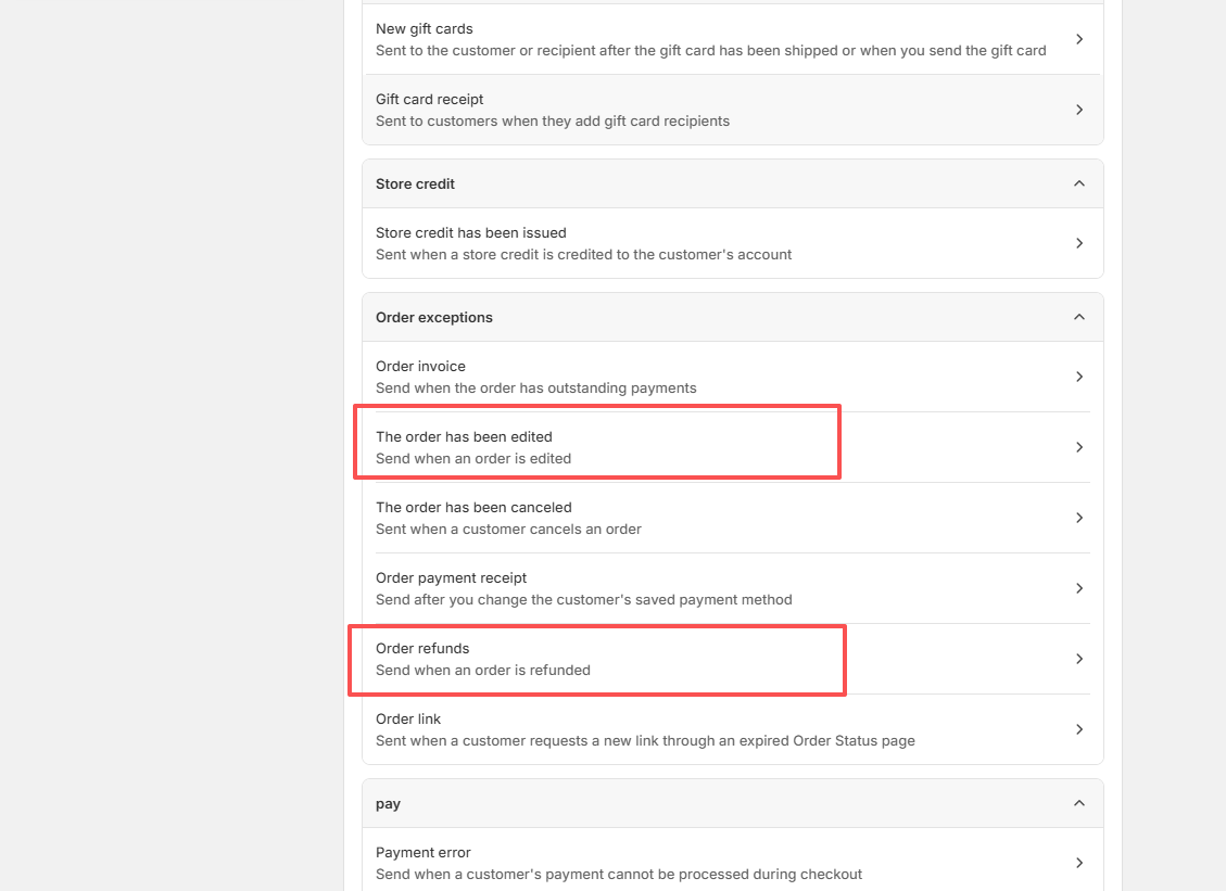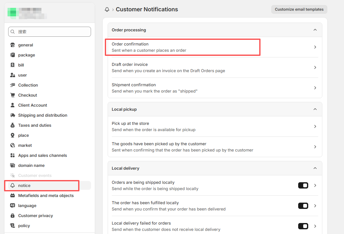 1. 在shopify后台Settings–>Customer Notifications分别找到【Order confirmation】,【The order has been edited】,【Order refunds】菜单