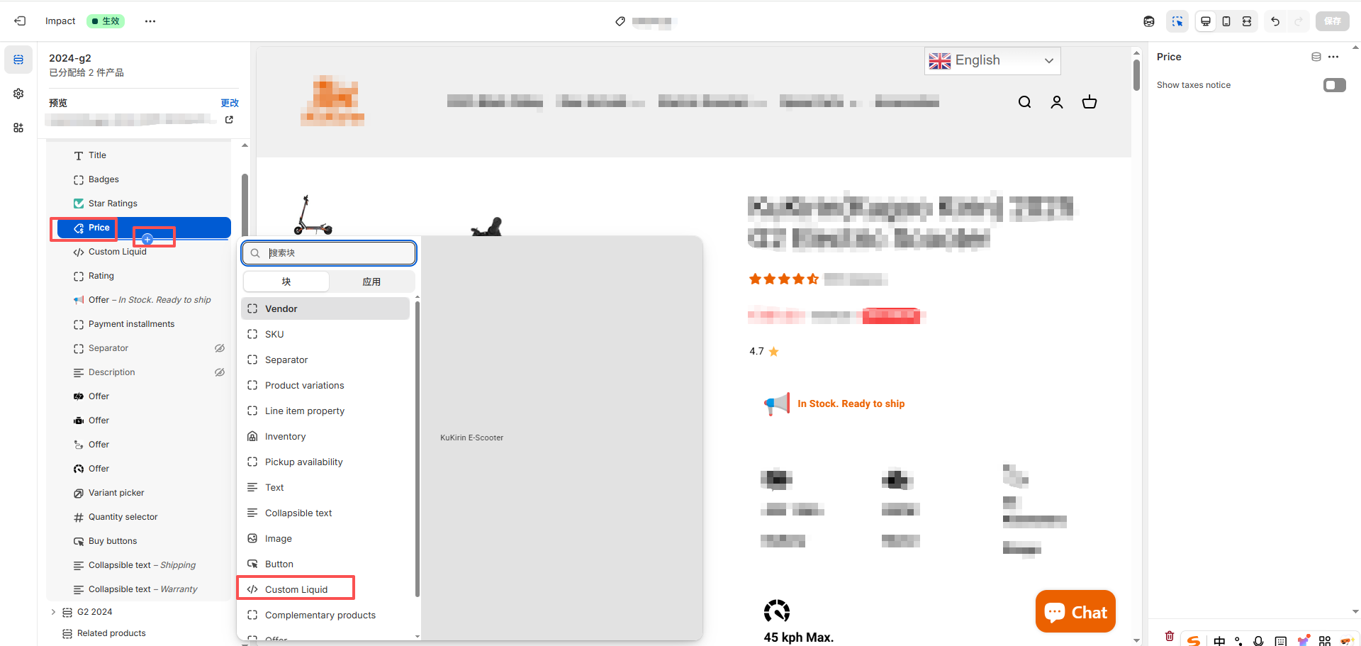 3、点击【price 】 —>【+】—>【Custom Liquid】