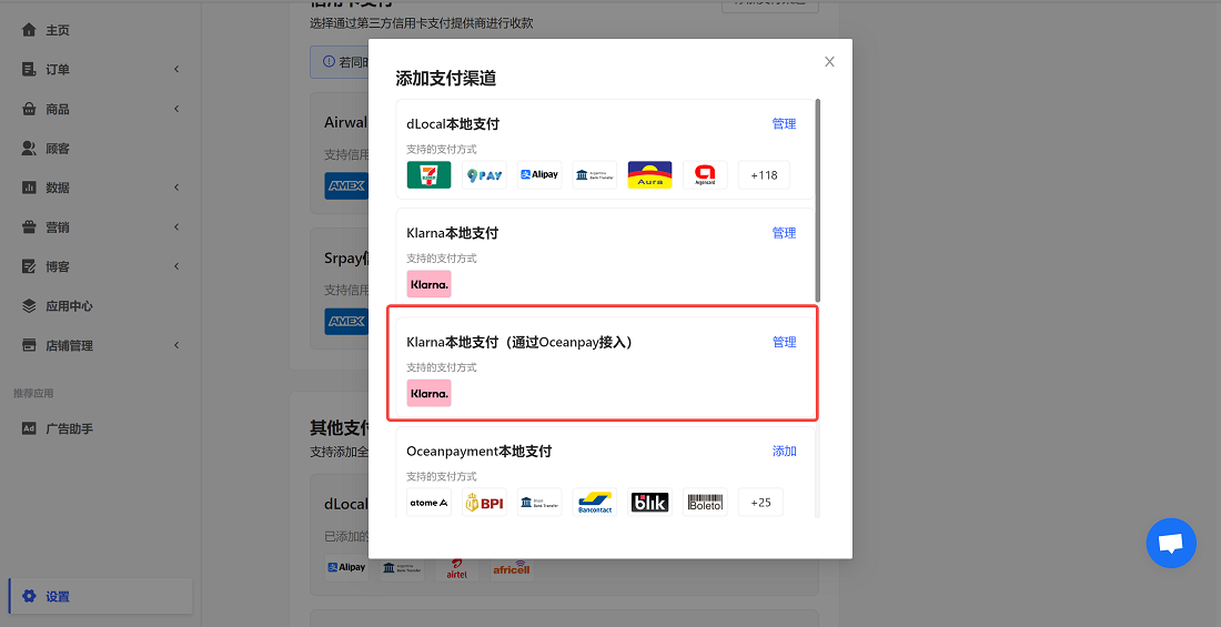 1. 登陆Shoprise店铺后台,访问【设置】-【收款方式】-【信用卡支付】 -【添加支付渠道】 -【Klarna本地支付(通过Oceanpay接入)】 → 【激活】。