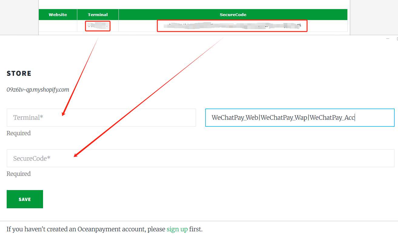 1. 根据邮件内容依次填入Terminal,SecureCode,Methods Code(默认为WeChatPay Web|WeChatPay Wap| WechatPay Acc),对应信息请注意复制齐全,且粘贴过来后注意配置信息前后是否存在空格,若有请删除空格,保存。